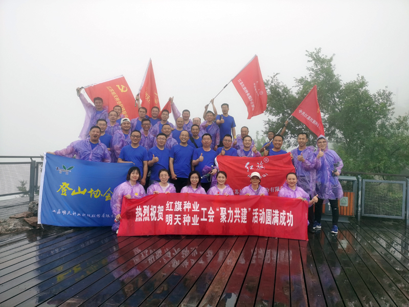 為進一步增進與兄弟單位的深厚友誼,會后,雙方工會開展“聚力共建、攀登紫金”的主題登山活動。途中偶遇瓢潑大雨,大家面對困境,不畏艱辛,互幫互助,堅持登頂,共同合影留念。“紅旗明天更美好、明天紅旗更鮮艷”成為響亮的共建口號。汗水與雨水的融合,完美的詮釋了紅旗種業、明天種業的企業文化,體現出種業人艱苦奮斗、勇攀高峰的精神面貌。