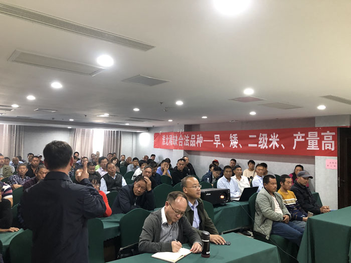 合影后,觀摩人員從田間返回睢寧桔子酒店,并就明兩優絲苗田間栽培管理開展培訓會。