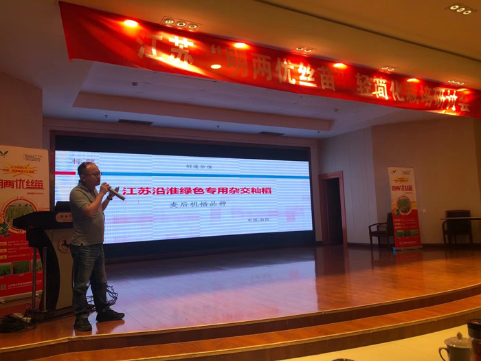接著由泗陽縣種植大戶就明兩優絲苗在泗陽種植、品種田間表現、肥料運籌情況作了詳細分享。種植戶認為明兩優絲苗:第一、熟期早特別適合江蘇淮河以北機插、沿淮直播,第二、株高矮、株型緊湊、抗倒性強,第三抗病性強,示范及種植四年田間無病害。是一個非常具有推廣價值和前景的大品種,同時也是一個淮河以北稀缺的雜交水稻機插合法品種。