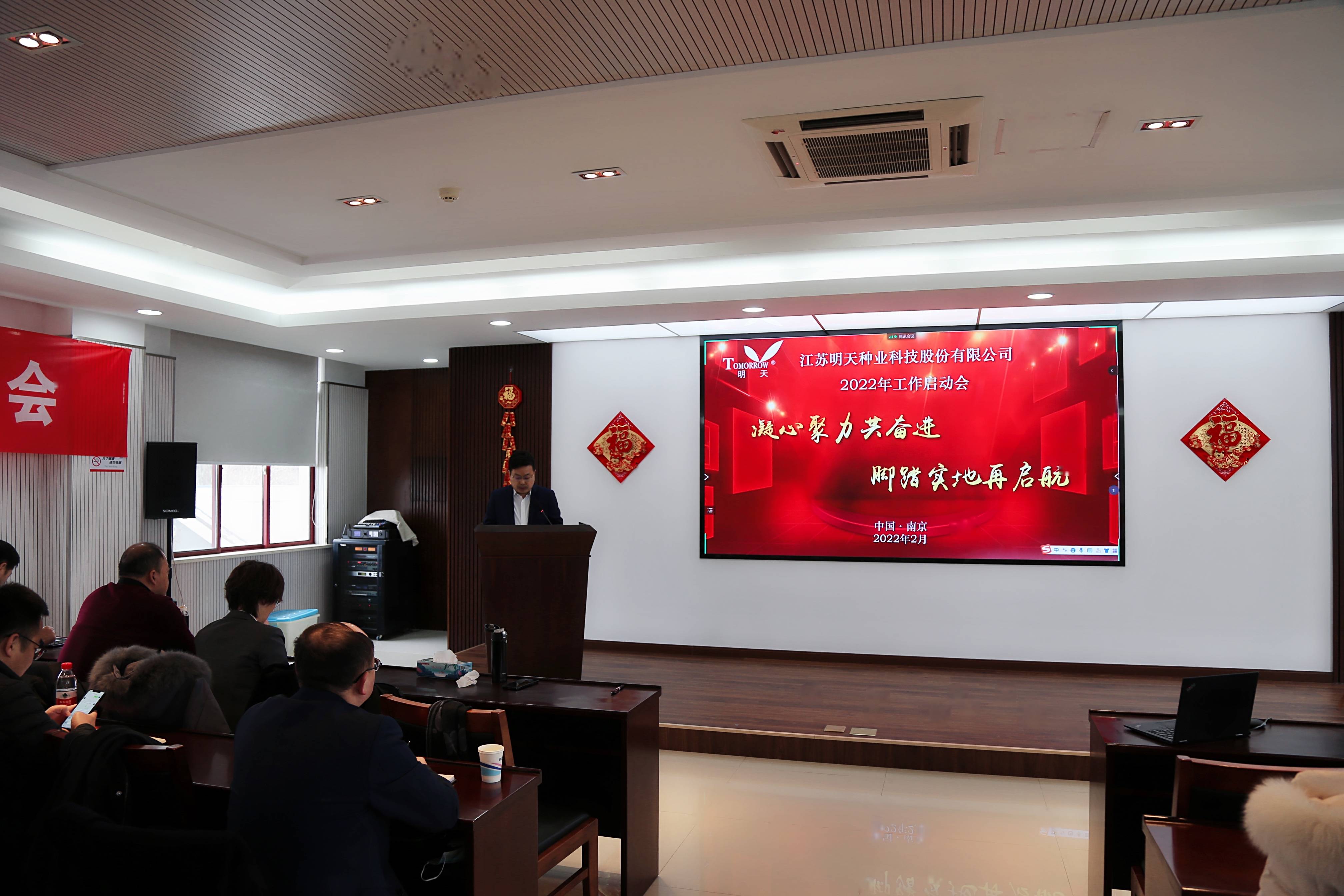 萬物逢春可復蘇,天道酬勤鑄不凡!新年伊始,為淡化節日氛圍,盡快投入工作狀態,2月17日,明天種業在江蘇省農科院糧食所會議室召開了2022年工作啟動大會,會議由副總經理胡玉成主持,嚴輝民總經理作了“凝心聚力共奮進·腳踏實地再起航”的動員報告。公司全體員工、子公司經理層及2021年度先進和優秀員工參加了本次會議。
