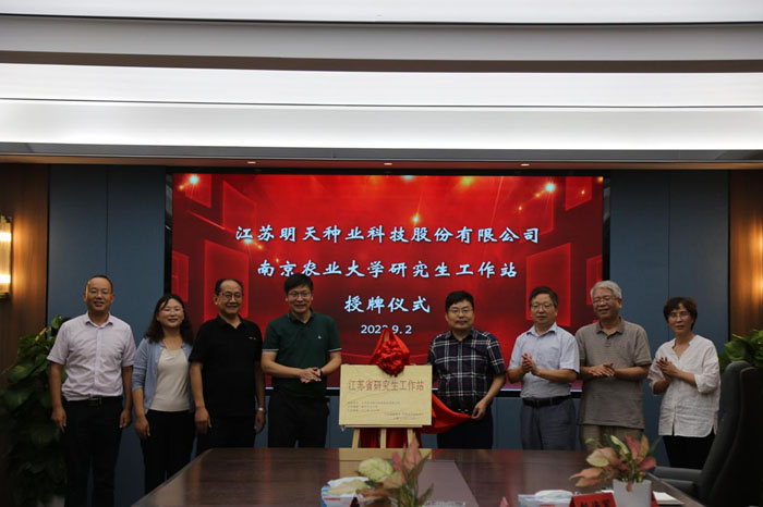 2022年9月2日,南京農(nóng)業(yè)大學(xué)農(nóng)學(xué)院與江蘇明天種業(yè)科技股份有限公司在明天種業(yè)會(huì)議室舉行江蘇省研究生工作站揭牌儀式。南京農(nóng)業(yè)大學(xué)農(nóng)學(xué)院莊森書記、張紅生教授、錢虎君教授、鮑永美教授、馬麗琴主任、江蘇省種子管理站二級(jí)調(diào)研員陳國斌、江蘇明天種業(yè)總經(jīng)理嚴(yán)輝民、副總經(jīng)理王波、副總經(jīng)理徐江參加了揭牌儀式。