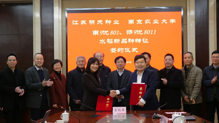 2023年1月9日,江蘇明天種業科技股份有限公司分別與南京農業大學、連云港市農業科學院在南京農業大學金陵研究院和公司會議室,就萬建民院士團隊秈稻品種最新成果“南9優801”、“揚9優8011”及江蘇明天種業與連云港市農科院聯合選育的粳稻新成果“連粳307”隆重舉行轉讓簽約儀式。江蘇明天種業成功簽約三品種全國獨占實施許可經營權。江蘇省農業農村廳、南京農業大學、連云港市農科院等領導、專家到會見證。