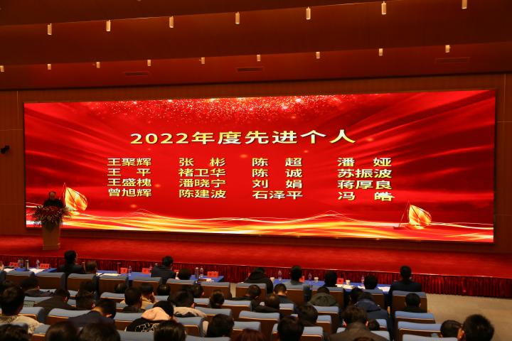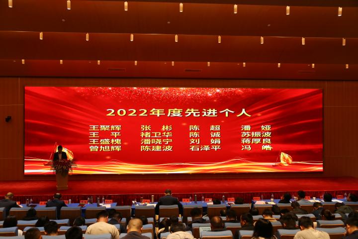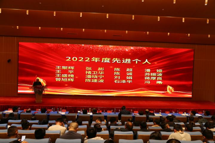 大會第二項議程由公司副總經理王波宣讀關于2022年度先進表彰的決定,由師洪飛、徐江等公司領導宣讀先進集體、杰出管理者、優秀管理者、先進個人先進事跡。
